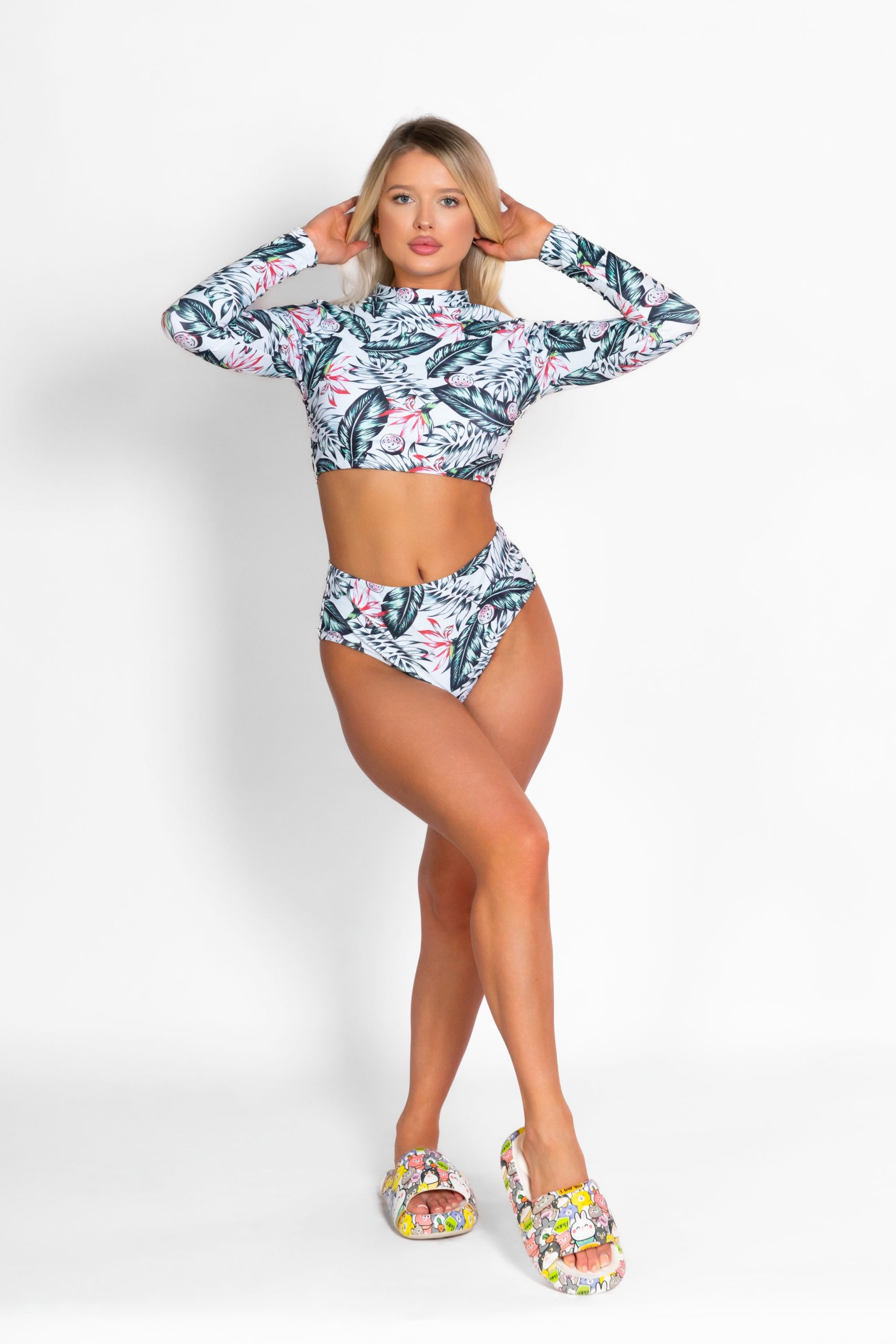 Яркий купальник в спортивном стиле для эффектного пляжного образа. Комплект состоит из укороченного топа с длинными рукавами-рашгард и плавок высокой посадки. Выполнен из эластичной ткани с красивым тропическим принтом. Купальник подчёркивает фигуру и идеально подходит как для пляжа, так и для активного отдыха у воды.